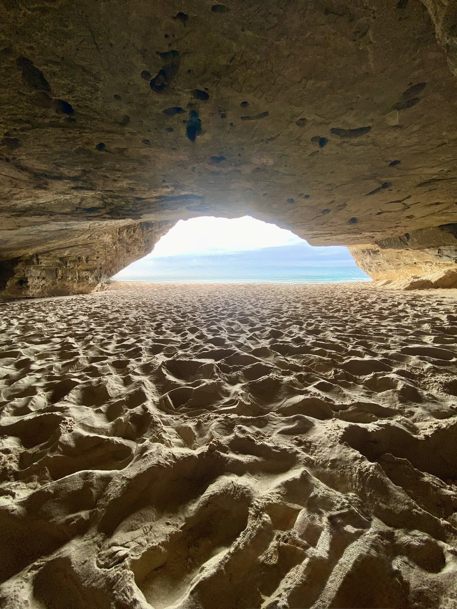 Falaises percées par la mer, grottes naturelles et plage déserte infinie créant un décor spectaculaire, idéal pour des clichés photos hors du commun.